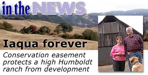 The Iaqua easement is part of the NRLT's Six Rivers to the Sea effort to conserve working ranch lands and water resources from the Six Rivers National Forest down to the coast in Humboldt, Del Norte and Trinity counties. The first easement was on Steve Hackett's family's Howe Creek Ranch near Ferndale, in 1995. Six more easements are in the works that could amount to 25,000-plus acres, says the NRLT's Erik Wilson. NRLT paid the Carringtons $3.5 million for the easement, using funds from the state Wildlife Conservation Board, the federal Forest Legacy Program and the state's Forest Legacy Program, plus grants from Humboldt County and a few individuals. The easement was valued at $4.1 million, says Wilson -- the Carringtons donated the remaining $635,000.
