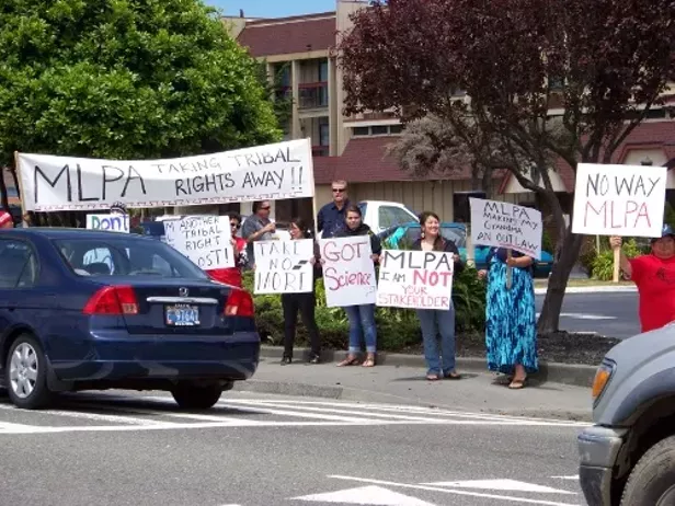At 1 p.m., the protesters filed into the Red Lion and walked down the hall into the meeting room. The SAT members were in their seats up front. The audience section filled up with the protesters. Molli White, a Karuk and member of the Klamath Justice Coalition, laid a large white posterboard on a side table and began felt-penning in black and red the words "MLPA" inside a large slashed-out circle. Said White: