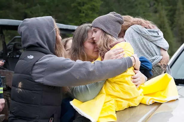 Mark McKenna, a local photographer on scene to document the girls’ reunion with their mother, said the girls stated that they spent Friday night sleeping under a log but got wet in the rain and so spent Saturday night in a “huckleberry cave.”