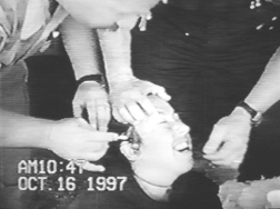 BLACKSTONE: "Videotape shot by officers themselves shows an unusual use of the chemical called pepper spray. With a cotton swab, officers applied it directly. Under most guidelines, the debilitating chemical is sprayed from several feet away and used only against violent suspects. It causes painful stinging of the membranes of the eyes, nose and throat; eyelids swell closed. One of the demonstrators was Lisa Sanderson Fox.
