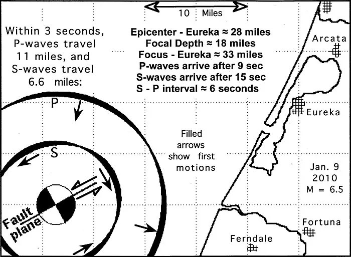 The seismic energy radiated in different directions is roughly depicted by the thickness of the diagram’s circles. The very weak P-waves felt by Sophie arrived in Eureka six seconds before the much more energetic S-waves. Fortuna, equally distant from the focus or hypocenter of the earthquake, experienced stronger P-waves relative to Eureka’s, but smaller S-waves (which are typically more damaging). Fortuna, fortunately, was neither in the direction of the fault’s strike nor perpendicular to it.